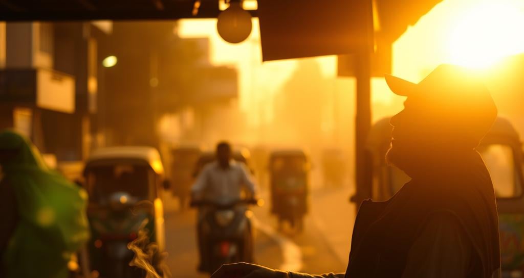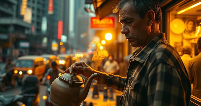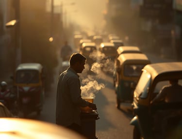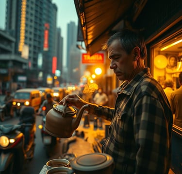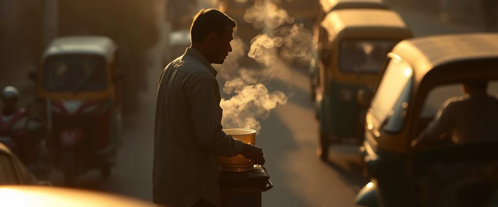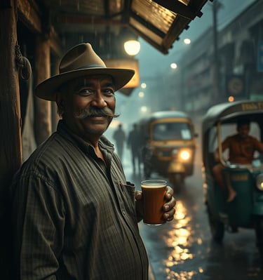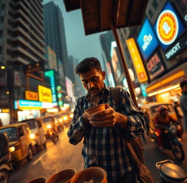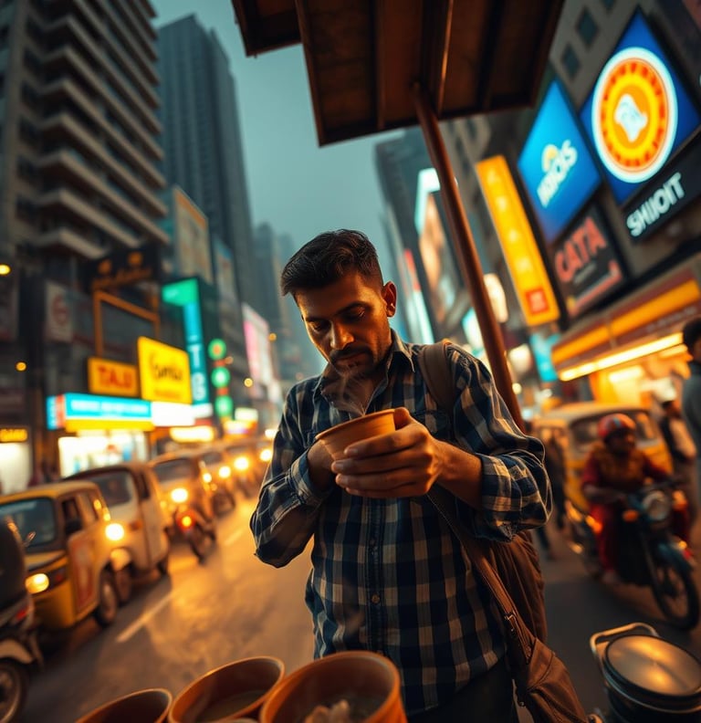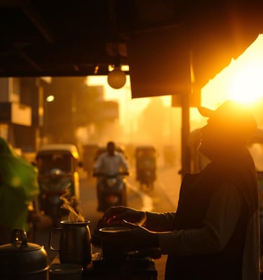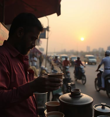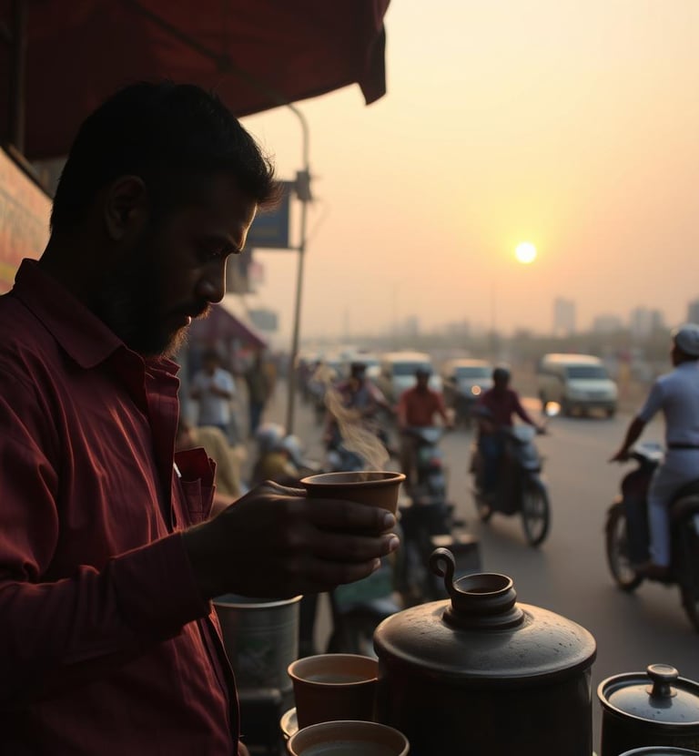 Amidst the bustling streets of Mumbai, a chai vendor pours steaming tea into a clay cup. The city hums around him, but for a moment, time slows as he watches the sun dip behind the skyline.